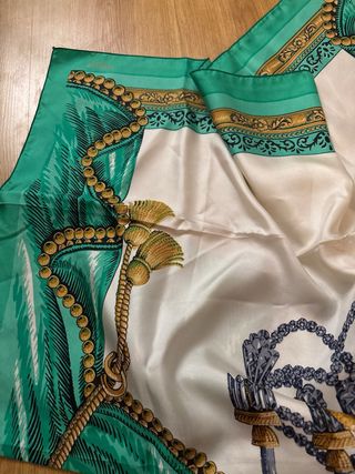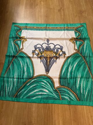 Elegante pañuelo de satén para señora con un diseño detallado. - Diseño central con una lámpara de araña dorada y azul. - Bordes decorados con motivos vegetales en verde esmeralda y detalles dorados. - Acabado satinado.