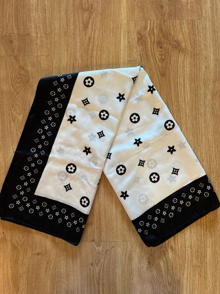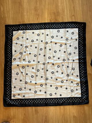 Pañuelo de cuello con un diseño moderno y llamativo. Es un accesorio versátil que puede complementar diferentes atuendos. - Estampado de estrellas y flores. - Borde decorativo.