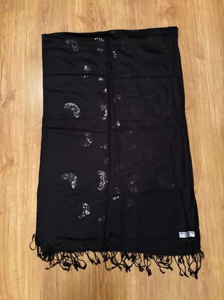 Elegante pañuelo tipo pashmina en color negro, adornado con un delicado diseño de lentejuelas y bordados. - Diseño floral con lentejuelas plateadas. - Bordados finos en hilo. - Flecos en los extremos.