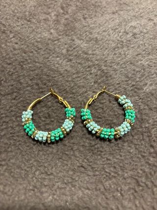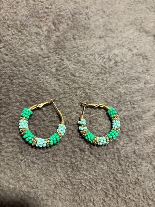 Pendientes de aro con un diseño llamativo y colorido. - Base dorada. - Cuentas de cristal en tonos verdes y turquesa. - Cierre de presión.
