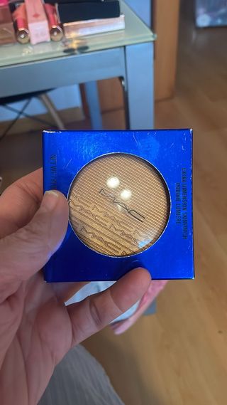 Polvo iluminador MAC Extra Dimension Skinfinish en tono dorado. El empaque es de color azul vibrante. - Acabado luminoso. - Textura sedosa.