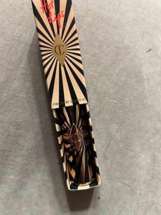Labial de Charlotte Tilbury en edición especial con un diseño llamativo. - Diseño con rayos dorados y negros. - Logotipo de la marca en relieve.