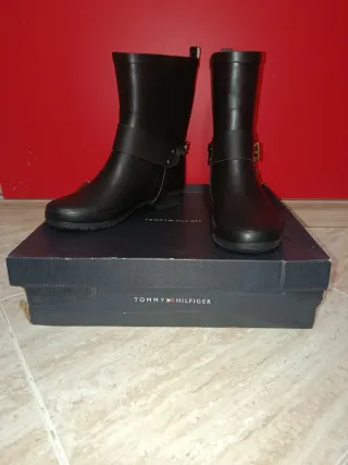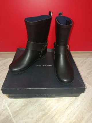 Botas de agua de la marca Tommy Hilfiger en color negro. Perfectas para días de lluvia. - Diseño elegante con correa y detalle de cadena dorada. - Material de goma. - Caña media. - son preciosas y comodas.