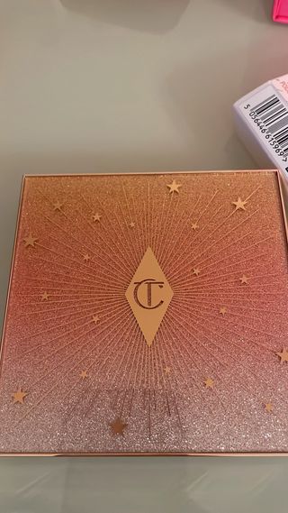 Paleta de maquillaje Charlotte Tilbury con un diseño de estrellas y degradado. - Acabado brillante y metálico. - Tonos dorados y rosados.