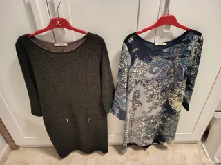 Pack de dos vestidos de la marca Guitare. - Vestido negro con cremalleras. - Vestido estampado multicolor.