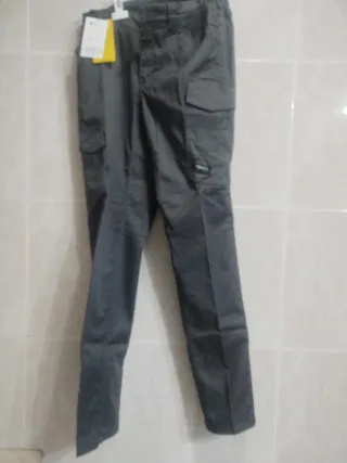 Pantalón de trabajo de color gris, talla 44. - Diseño tipo cargo con múltiples bolsillos. - Cierre de cremallera y botón. - Tejido resistente para el trabajo diario.