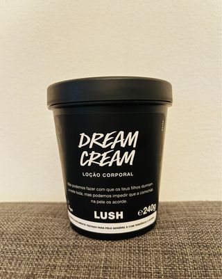 Crema corporal Dream Cream de Lush, ideal para pieles sensibles. - Formato de 240g. - Textura suave y nutritiva. - Fórmula testada para pieles sensibles.