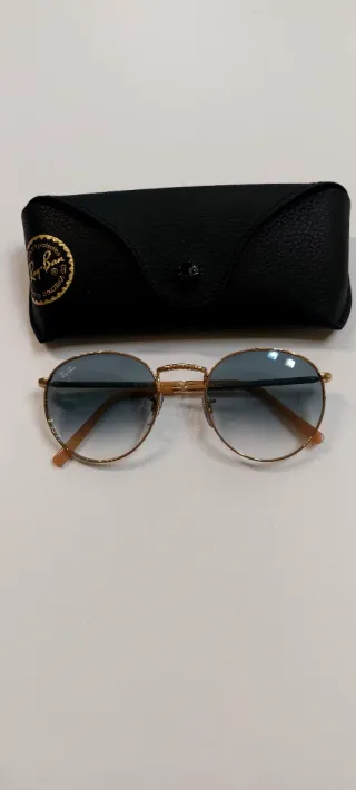 Gafas de sol Ray-Ban con montura dorada y lentes degradadas. - Montura metálica redonda. - Lentes con degradado azul. - Incluye estuche negro.