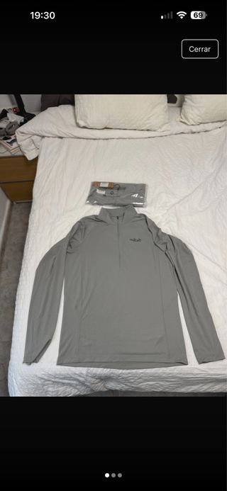 Camiseta de manga larga de la marca Rab en color gris. Presenta un diseño con media cremallera en el cuello. - Cuello con media cremallera. - Logo de la marca en el pecho.