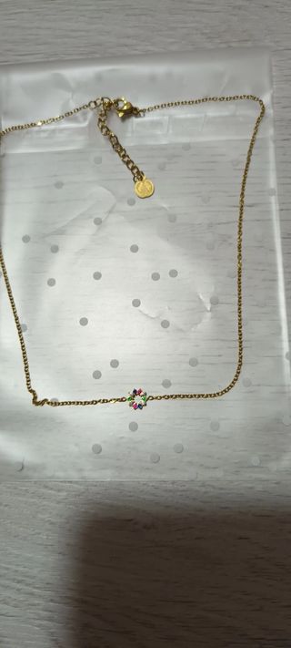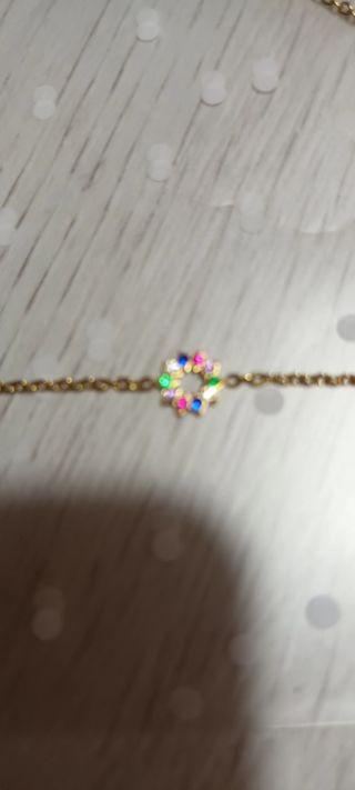 Elegante cadena dorada con un delicado colgante adornado con circonitas de varios colores. - Diseño circular con circonitas. - Cadena fina y ajustable.