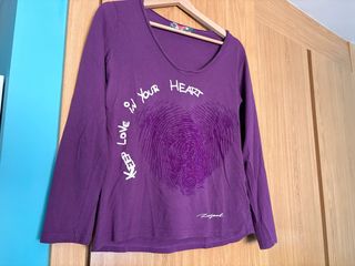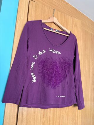 Camiseta de manga larga con un diseño original de Desigual. Color morado. Manga larga. Talla L. - Estampado de huella dactilar. - Mensaje Keep Love in Your Heart.