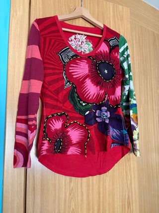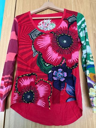Camiseta de manga larga con un diseño colorido y original. Marca Desigual Talla L Manga larga - Estampado frontal con flores y círculos. - Combinación de colores vibrantes. - Cuello redondo.