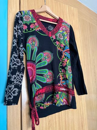 Camiseta de manga larga con un diseño vibrante y llamativo. Marca Desigual. Talla M Manga larga - Estampado floral y paisley. - Detalle de nudo lateral. - Puños negros. - Cuello en V con ribete.