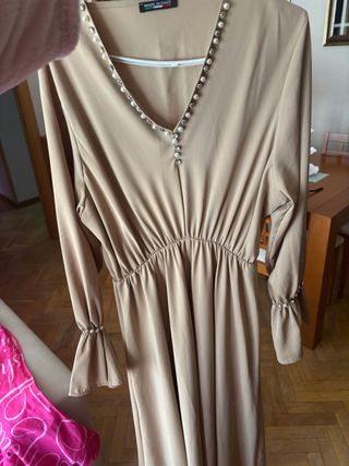 Elegante vestido largo de color beige, perfecto para ocasiones especiales. Presenta un diseño con cuello en pico y detalles de perlas. - Cuello en pico adornado con perlas y pedrería. - Cintura elástica fruncida para un ajuste favorecedor. - Mangas largas con puños decorados con perlas. - Cierre con pequeños botones en la parte delantera del escote.