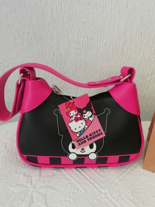 Bolso de Kuromi, la amiga de Hello Kitty. Un accesorio divertido y llamativo. - Diseño con Kuromi y otros personajes. - Combinación de colores negro y rosa vibrante.