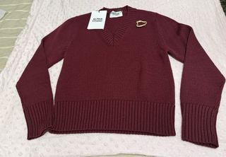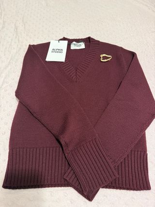 Jersey de cuello pico de la marca Alpha Studio. - Tejido de lana merino. - Color rojo intenso (granate) - Detalle de broche dorado. - Puños y bajo acanalados. - Talla 40