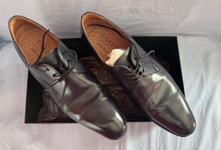 Elegantes zapatos de vestir de la marca Calce. - Diseño clásico y sofisticado. - Acabado brillante. - Cordones para un ajuste seguro. - Suela de cuero. Usados una vez