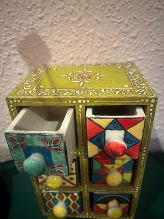 Original joyero artesanal con un diseño único y colorido. Perfecto para organizar tus pequeñas joyas o accesorios. - Diseño de seis cajones. - Tiradores de bola. - Cada cajón tiene un diseño de azulejo diferente.