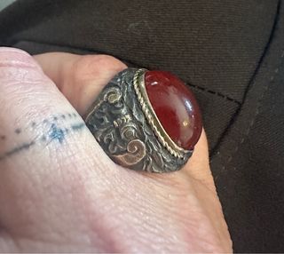 En venta precioso anillo de diseño artesanal y estilo vintage/étnico. Tiene más de 100 años. Una pieza única con mucha personalidad, ideal para amantes de la joyería con carácter o coleccionistas de piezas. • Material: Plata labrada (presenta una bonita pátina envejecida que resalta los relieves del grabado) y plata chapada oro • Piedra: Gran cabujón central de Cornalina (ágata roja) en tono teja/rojizo, con un brillo natural excelente. • Detalles: El engaste cuenta con un borde trenzado tipo cordón y laterales con motivos ornamentales cincelados. • Estado: Muy buen estado de conservación, sin golpes ni desperfectos en la piedra.