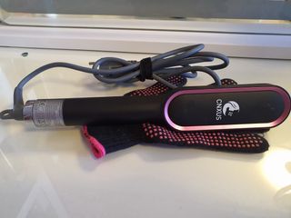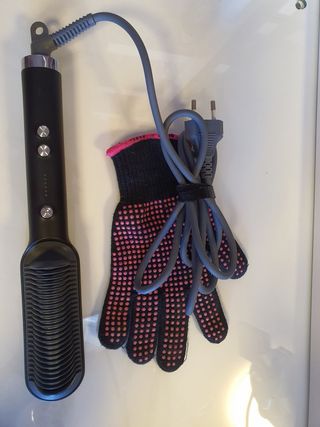 Peine eléctrico para el cuidado del cabello, diseñado para facilitar el peinado y alisado. - Incluye un guante protector para evitar quemaduras. - Cable de alimentación con enchufe europeo.