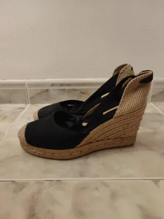 Cuñas de mujer nuevas. - Cierre con lazada. - Punta cerrada. - Plataforma de esparto. - Color negro
