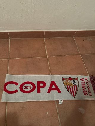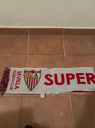 Bufanda reversible del Sevilla Fútbol Club. - Diseño con el escudo del club. - Frase SUPER en grande. - Flecos en los extremos.
