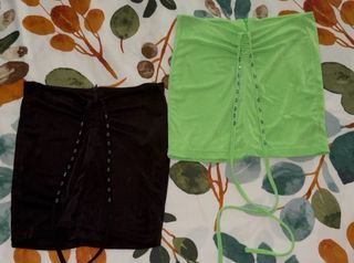 Pack de dos faldas de mujer, cada una con un diseño único. - Diseño fruncido con cordones. - Detalle de abalorios en la parte frontal. - Material suave, elástico y brillante.