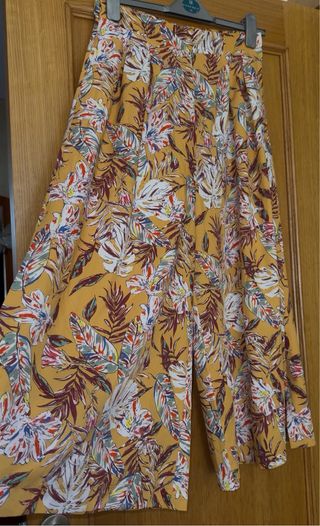 Pantalones de vestir anchos con un vibrante estampado floral. - Diseño de pierna ancha y obertura bajera. - Estampado multicolor con base amarilla. - Estilo recto.