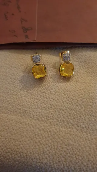 Elegantes pendientes chapados en oro con un diseño moderno. Cuentan con una piedra central de color amarillo y detalles de circonitas cúbicas. - Chapado en oro. - Piedra central de color amarillo. - Detalles de circonitas cúbicas.