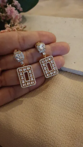 Elegantes pendientes con diseño rectangular y detalles brillantes. - Chapado en oro. - Abalorios blancos incrustados.