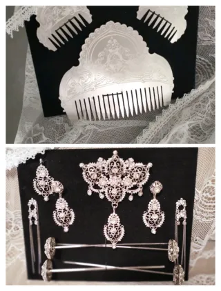 Conjunto de aderezo y peinetas con un diseño elegante. - Aderezo con detalles ornamentales. - Dos peinetas a juego. - Acabado plateado.