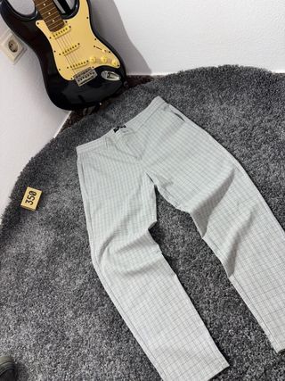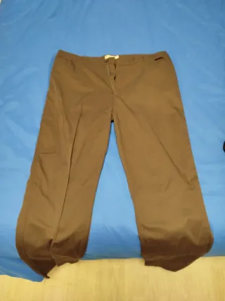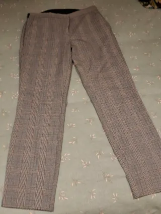 Pantalón de pinzas tipo traje Tiene goma en la cintura para ajustar Sirve para talla s más ajustado y talla xs Estampado pata de gallo en tonos marrones y gris Está perfecto!