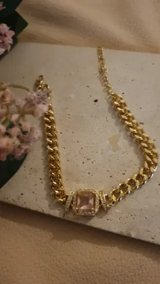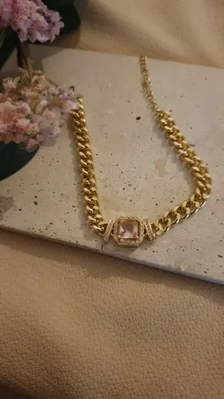 Elegante pulsera chapada en oro con un detalle central. - Diseño de eslabones cubanos. - Piedra central de color rosa. - Acompañada de pequeños cristales.