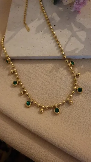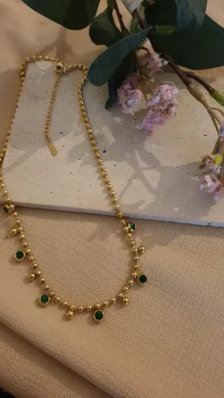 Elegante collar chapado en oro con pequeños detalles que le dan un toque especial. - Cadena fina con cuentas doradas. - Colgantes con piedras verdes. - Cierre de mosquetón.