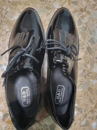 Elegantes zapatillas de charol negro para mujer. - Diseño con flecos. - Cierre de cordones. - Logo de H&D en la plantilla.
