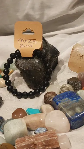 Pulsera artesanal elaborada con piedras naturales de turmalina negra. Cada piedra tiene una forma irregular y un brillo único.Piedras de turmalina negra. - Diseño de cuentas irregulares.El significado espiritual de la turmalina es principalmente protección, purificación y equilibrio energético, actuando como un escudo contra energías negativas y transformándolas en positivas, además de enraizar la energía espiritual y alinear los chakras, con propiedades específicas según su color, como la negra (protección), rosa (amor), verde (corazón/curación) y azul (comunicación).