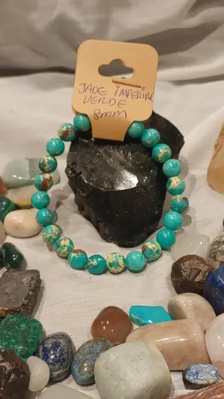 Pulsera de piedra natural con cuentas de jade imperial verde - Cuentas de 8mm de diámetro. - Diseño único con vetas naturales.El jade imperial verde simboliza armonía, prosperidad, longevidad y sabiduría, actuando como un potente amuleto protector que aleja energías negativas y atrae buena suerte, paz interior y equilibrio emocional, alineando el cuerpo, mente y espíritu a través de su conexión con el chakra corazón.