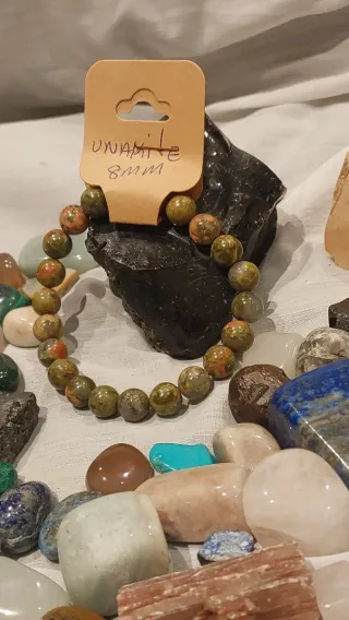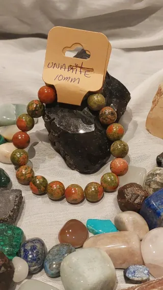 Pulsera de piedras naturales de Unakita.Cuentas de 8mm. - Combinación de tonos verdes y anaranjados.La unakita es una piedra espiritual de visión, equilibrio y transformación, que armoniza el corazón y el espíritu al liberar emociones pasadas para el crecimiento personal, abriendo el camino hacia el futuro sin olvidar las lecciones vividas, fortaleciendo la autocompasión y la conexión con la tierra para una mayor estabilidad y claridad interior.