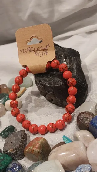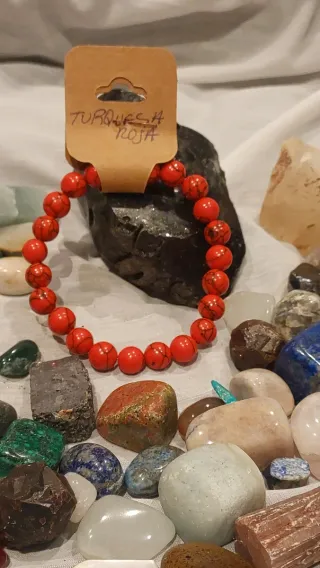 Pulsera de cuentas con un diseño llamativo.Cuentas de piedra turquesa teñida de rojo. - Patrón de vetas oscuras sobre fondo rojo.La turquesa roja combina la energía del chakra raíz (rojo) con la intuición y calma del turquesa, promoviendo conexión a tierra, vitalidad, pasión y protección; equilibra la fuerza y la serenidad, fomentando la creatividad, resistencia y la sabiduría, y ayudando a disipar energías negativas para una transformación espiritual.