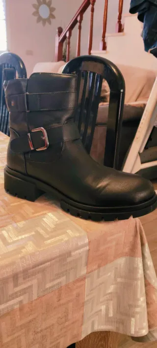 Botines negros con detalle de hebilla metálica. Nuevos. - Diseño moderno y versátil. - Suela gruesa y resistente. - Cierre lateral. Recoger en Aldaia ó Domeño. No hago envíos. Mas cosas en mi perfil.