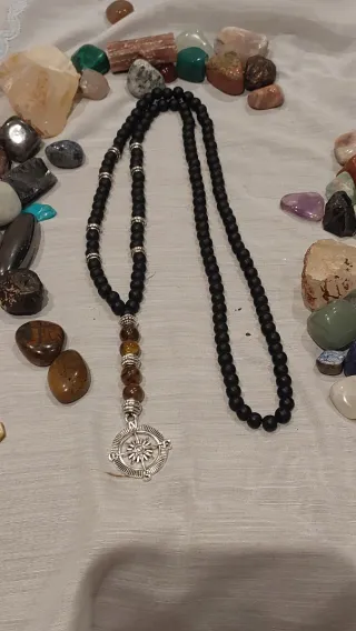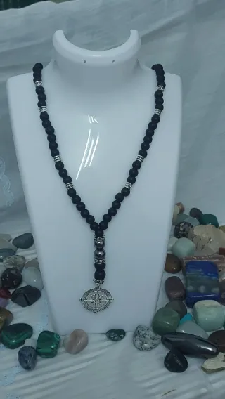 Elegante collar con cuentas de piedra natural ágata negra y ojo de tigre. El diseño se complementa con un colgante de brújula. Piedra natural ágata negra. - Detalle de piedra ojo de tigre. - El ojo de tigre aporta conexión con la tierra mientras el ágata negra ayuda a disipar, bloqueos emocionales. -70cm,6mm