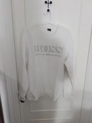 Sudadera de manga larga de la marca Hugo Boss en color blanco. Presenta un diseño con logo con puntitos en la parte delantera y detalles en los bajos. Fabricante talla XL pero talla pequeño, más bien una L.