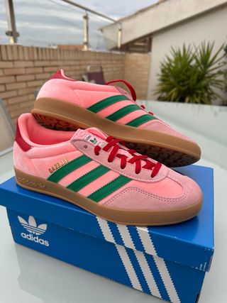 Zapatillas Adidas Gazelle Indoor en color rosa con detalles verdes Nuevas sin utilizar Talla 38 2/3 Incluye cordones rojos y rosas
