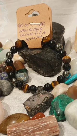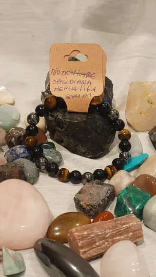 Pulsera de piedras naturales con cuentas de 8mm.Combinación de obsidiana, ojo de tigre y hematita. - Diseño para protección personal.Ojo de tigre: fomenta la confianza, el enfoque y el coraje para alcanzar tus objetivos. Obsidiana: actúa como un escudo protector, eliminando energías negativas y bloqueos emocionales. Hematita: equilibra mente, cuerpo y espíritu, aportando estabilidad y serenidad.