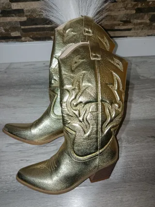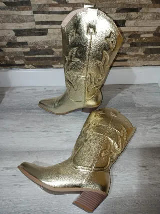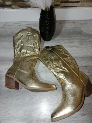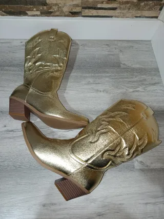 Botas estilo cowboy en color dorado, talla 41. Un toque de brillo para tu estilo. - Diseño con detalles bordados. - Tacón cuadrado y cómodo. - Caña media.