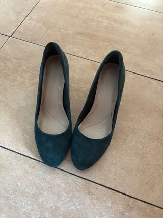 Elegantes zapatos de tacón Clarks en color verde, perfectos para cualquier ocasión. - Material exterior de ante. - Tacón de aguja fino. - Diseño de punta fina. -Usado solo una vez