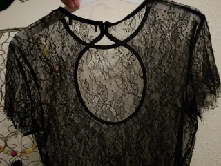 Elegante top de fiesta con un diseño de encaje transparente. Ideal para ocasiones especiales. - Tejido de encaje con perlitas brillantes. - Manga corta. - Abertura circular en la espalda. - Bajo con acabado festoneado. He cortado las etiquetas al ser de encaje transparente.