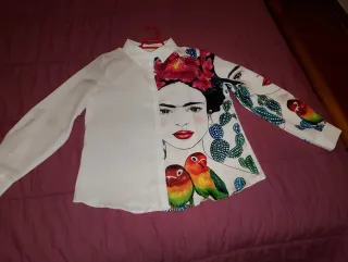 Blusa con un diseño vibrante y artístico. - Estampado frontal de Frida Kahlo. - Detalle de pájaros y cactus. - Manga larga.