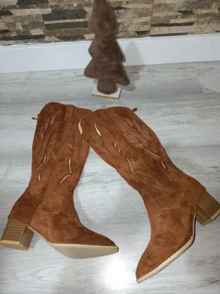 Botas de estilo cowboy en color marrón. Son nuevas y están en perfecto estado. - Diseño con detalles bordados. - Tacón cuadrado. - Punta afilada.