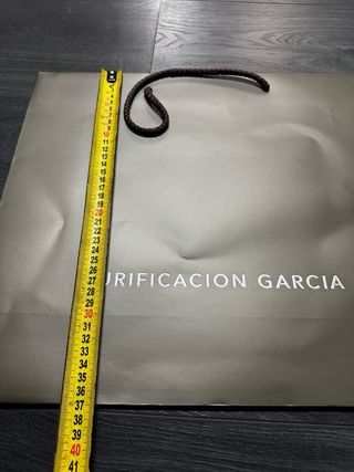 Elegante bolsa de papel de la marca Purificación Garcia. - Color beige. - Asa de cuerda trenzada. - Logo de la marca en blanco.